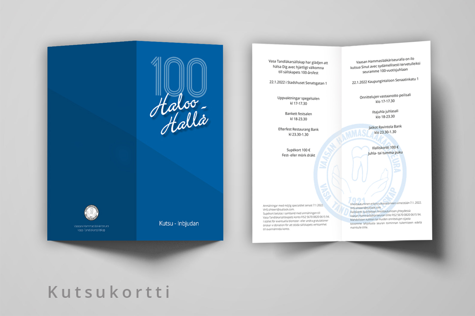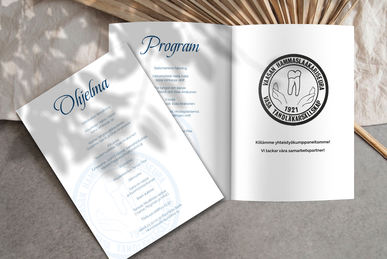 taittotyön ja kannensuunnittelun sekä kutsukortit ja 16 sivuisen Ohjelma/Menu vihkosen.
